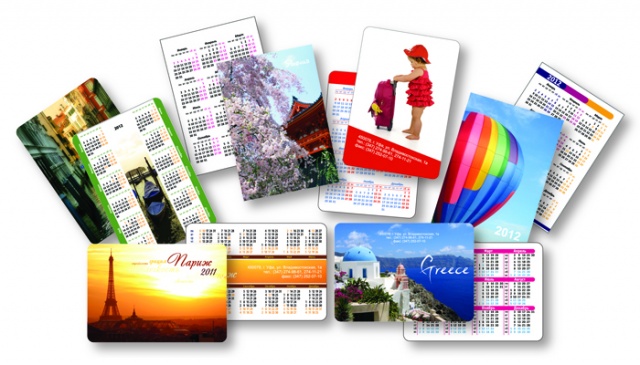 Карманными называют двухсторонние календари маленького размера. С лицевой стороны традиционно размещается любое изображение, картинка, фото, рекламное сообщение и т.п., а с другой стороны наносится обычная календарная сетка.