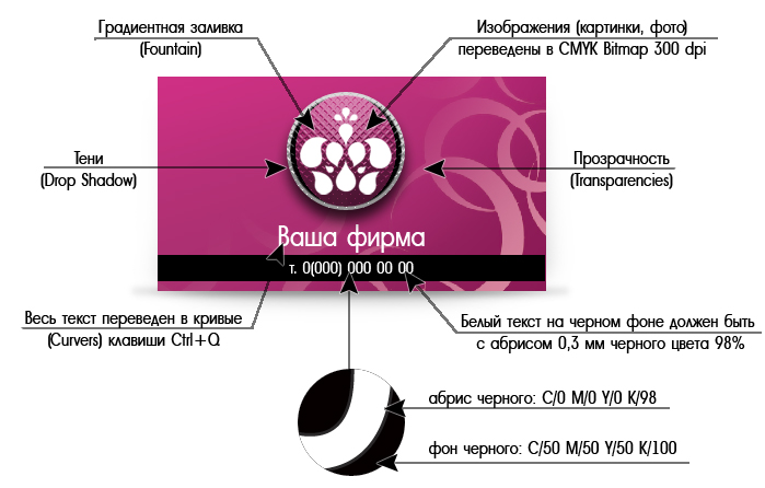- если вы хотите получить черный цвет по настоящему черным, а не темно серым, то черный цвет должен быть составным C50,M50,Y50, K100 .